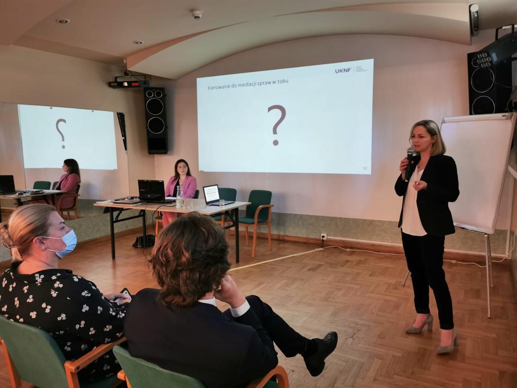 Magdalena Gronowska-Sienkiel, Dyrektor Gabinetu Komisji w Urzędzie KNF, podczas szkolenia dla Sędziów Koordynatorów ds. Mediacji zorganizowanego przez Ministerstwo Sprawiedliwości, które odbyło się w Zakopanem, przedstawiła sędziom założenia programu mediacji dla klientów banków posiadających kredyty w CHF oraz banków, realizowanego przez Sąd Polubowny przy Komisji Nadzoru Finansowego. Rozmowy dotyczyły m.in. korzyści płynących z pozasądowego trybu rozwiązywania sporów. Program oparty o założenia przedstawione w grudniu ubiegłego roku przez Jacka Jastrzębskiego, Przewodniczącego KNF, ruszył w październiku br. Pierwsze efekty to 5 tys. wniosków o mediacje oraz 4 tys. umówionych spotkań mediacyjnych. 25 października zawarta została pierwsza ugoda klienta z bankiem.