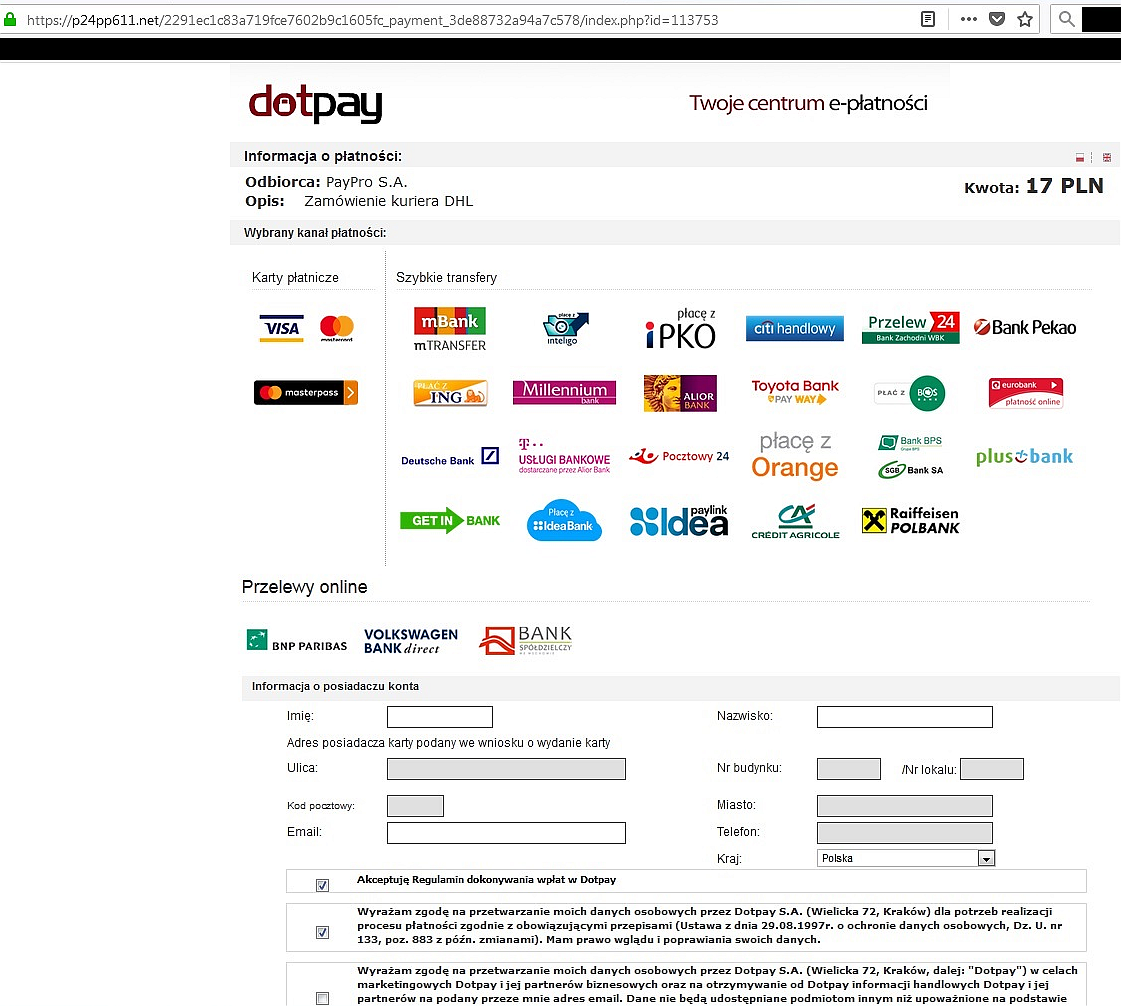 W ostatnim etapie oszustwa kupujący podaje swoje dane do płatności internetowych, gdzie po kliknięciu przycisku zaloguj ekran na stronie nie zmienia się w docelową witrynę płatniczą.