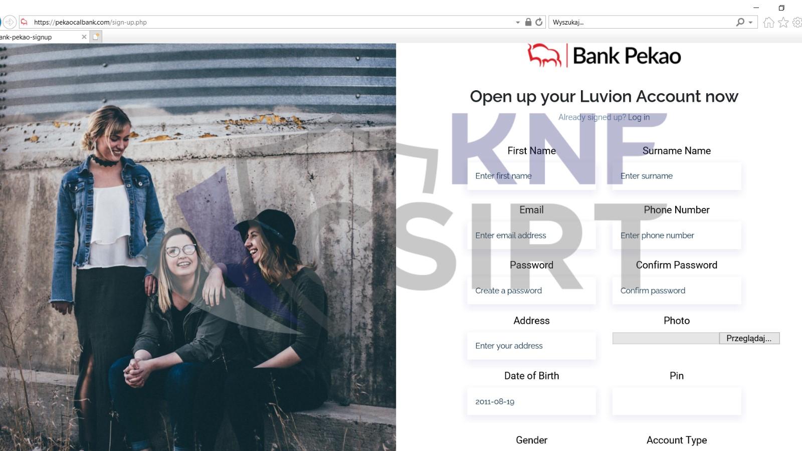 Dwie niebezpieczne witryny nawiązywały bezpośrednio do banku PEKAO SA, gdzie zostały umieszczone pola do wysłania danych osobowych. Mogłoby to skutkować wykorzystaniem tychże informacji przez złodziei oraz dalszym ich obrotem na czarnym rynku.